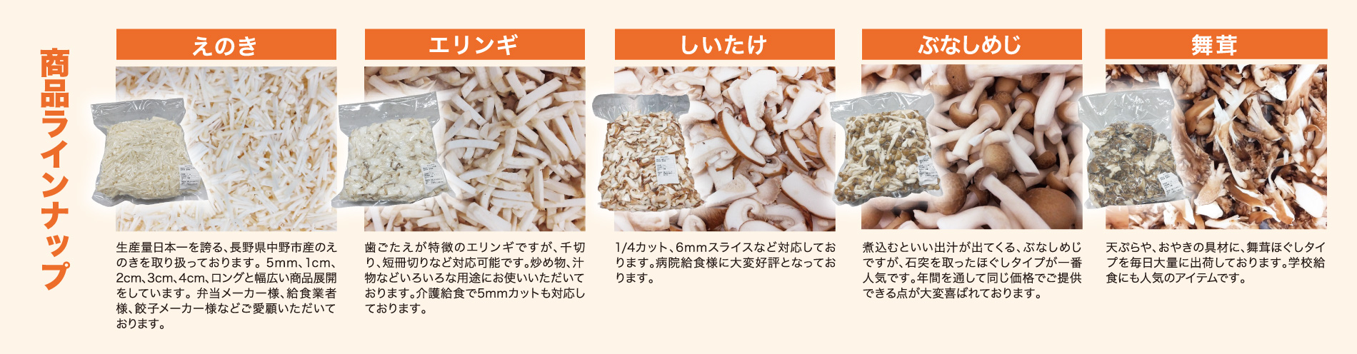 良質なきのこばかりを仕入れさせていただき、きのこそれぞれの特性を考慮しつつ劣化しないうちに素早く加工しております。