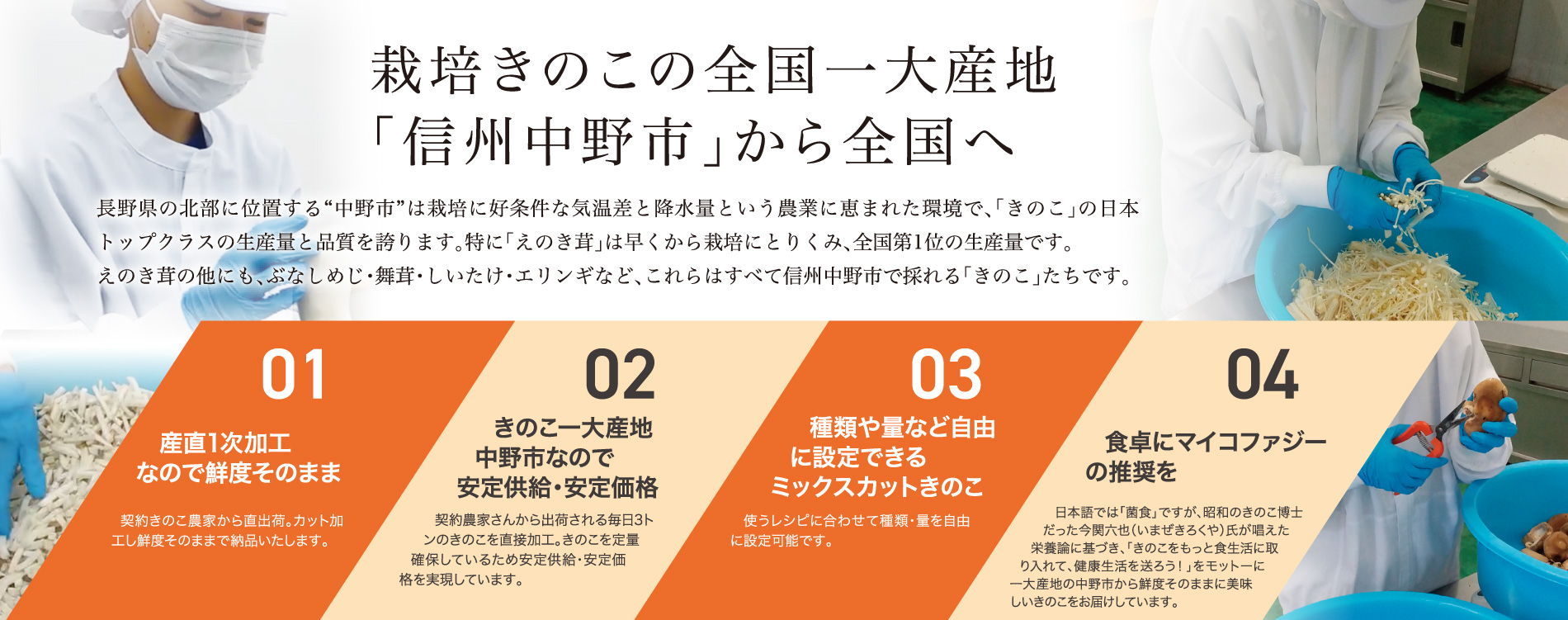 生産量日本一を誇る、長野県中野市産のえのきを取り扱っております。 5mm、1㎝、2㎝、3㎝、4㎝、ロングと幅広い商品展開をしています。 弁当メーカー様、給食業者様、餃子メーカー様などご愛顧いただいて おります。